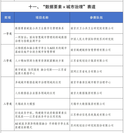 江苏分赛区城市治理赛道参赛项目,涉及智慧城市、智能交通、环境监测等多个领域,充分展示了数据要素在推动城市治理中的重要作用。经过激烈角逐,该赛道共产生了一等奖2名,二等奖3名,三等奖5名。