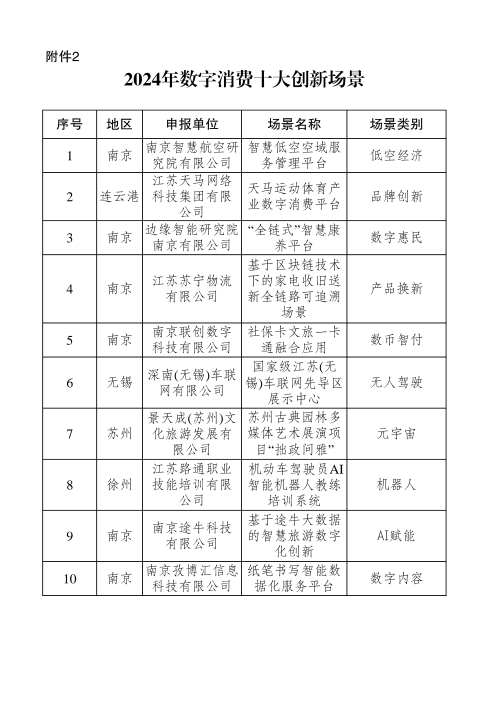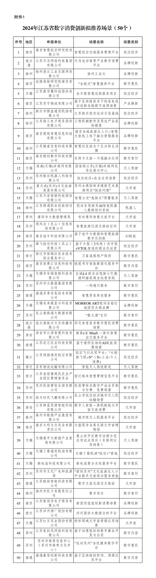 征集工作开展以来,各设区市积极响应、认真组织,共征集场景项目233个,经地方初审、形式审查、专家评审、合规审查等程序,拟确定“智慧低空空域服务管理平台”等50个场景为“2024年江苏省数字消费创新场景”(附件1),其中10个类别中的第1名拟确定为“2024年江苏省十大数字消费创新场景”(附件2)。现将名单予以公示。